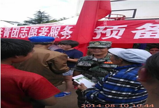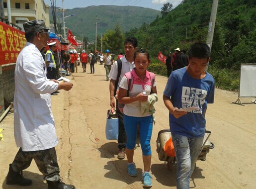 專家組成員 (副院長、昆明市心理危機研究與干預中心執(zhí)行主任阮冶)頂著烈日向災民發(fā)放宣傳資料