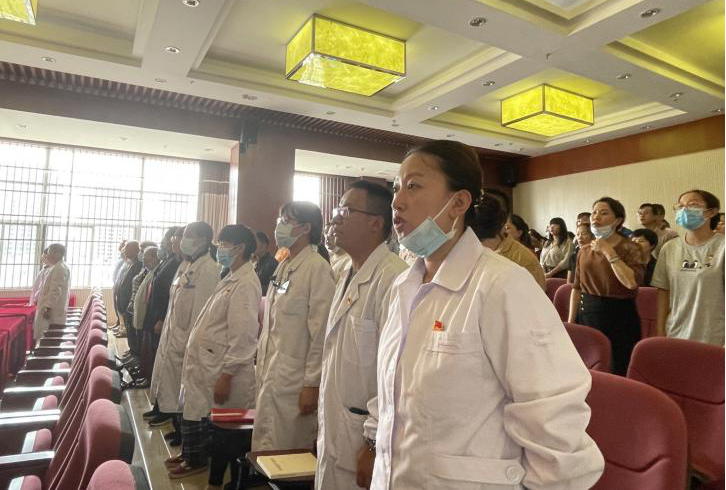 在陳志祥同志宣布了活動(dòng)議程后,醫(yī)院全體黨員鏗鏘有力、莊嚴(yán)肅穆地奏唱國(guó)歌,會(huì)議正式拉開序幕。