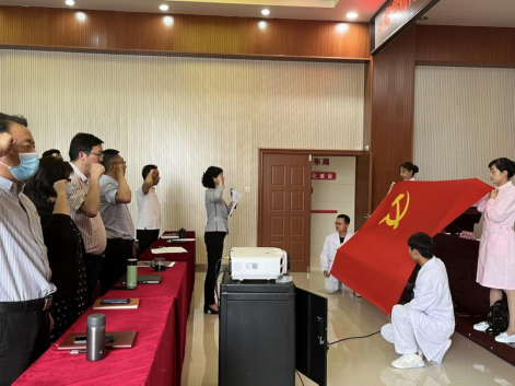 黨委書記覃東明帶領(lǐng)全體黨員面對黨旗莊嚴(yán)宣誓,重溫入黨誓詞
