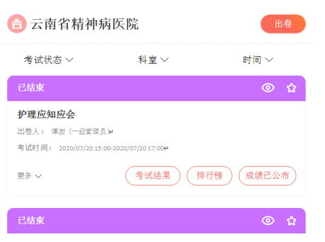 考試采取密碼進(jìn)入保證了考場安全性,試題采用亂序隨機(jī)生成的方式使得每個人題目順序不同避免抄襲現(xiàn)象。本次考試技術(shù)操作由劉高負(fù)責(zé),監(jiān)考教師為各科室護(hù)士長負(fù)責(zé),同時考試期間護(hù)理部不斷進(jìn)科室巡查。本次考試題型設(shè)置了單選題、多選題和判斷題,總分100分,60分為合格線。