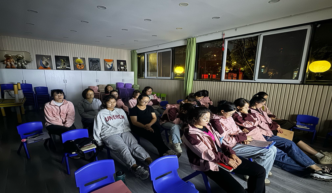 在團(tuán)體心理輔導(dǎo)場次,李蕊老師和李識昆老師帶來了心理“孤山”如何“相連”的團(tuán)體心理輔導(dǎo),接著20分鐘的《隨緣》冥想修行,對世欣幼兒園的幼師群體的心理健康知識水平有了進(jìn)一步提升,對增強(qiáng)自我心理保健能力、預(yù)防心理疾病、形成有益于個人的健康行為和生活習(xí)慣有著重要意義。