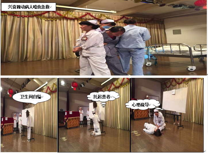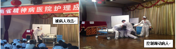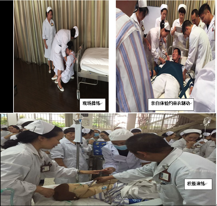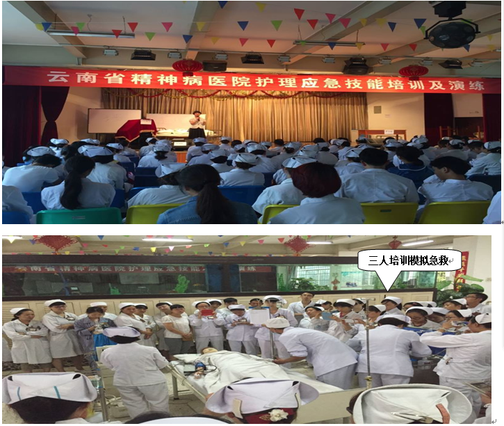 為提高我院護(hù)理人員的急救應(yīng)急技能,2015年7月14-15日云南省精神病醫(yī)院護(hù)理部進(jìn)行了為期兩天的護(hù)理應(yīng)急急救技能培訓(xùn)及演練,內(nèi)容包括:兩人、三人配合模擬急救,噎食急救,自縊急救,沖動(dòng)行為干預(yù)技術(shù)及約束衣的運(yùn)用、防暴技能情景模擬。全院共229名護(hù)士參加了此次培訓(xùn),培訓(xùn)率99.56%。通過理論講解、現(xiàn)場急救、情景模擬等授課方式進(jìn)行了精神科常見的幾種急救應(yīng)急技能的授課。