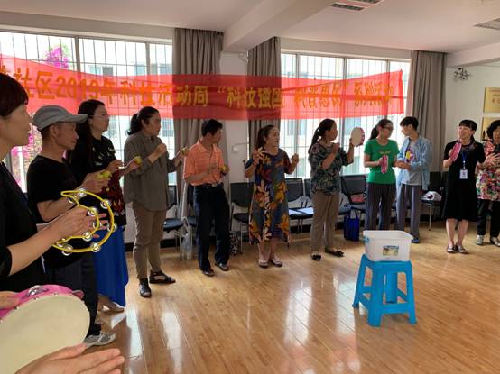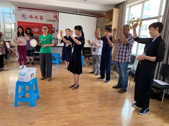 在接下來的環(huán)節(jié)中,幾位康復訓練老師運用沙蛋、手鈴、手鼓和大家一起進行音樂律動游戲,這個游戲是根據音樂旋律的輕重緩急來搖動手中的樂具,在游戲中可以讓患者們學會集中精力聽音樂打節(jié)拍,使患者保持愉快的心情,使壓抑的情緒得到釋放,并保持良好的情緒進行康復訓練。