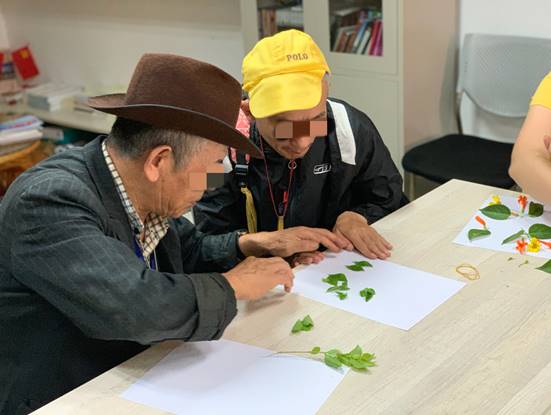首先開始的是藝術(shù)治療,朱老師帶來了許多樹葉、鮮花、畫紙、彩色鉛筆和粘膠,給大家布置了一個任務——創(chuàng)作一幅樹葉拼貼畫。大家對這樣的手工活動很感興趣,紛紛開始選擇了自己喜歡的樹葉、花瓣。在兩位老師的引導下,大家開始拆剪樹葉和花瓣,一位大叔首先用彩色鉛筆畫了一顆樹干,然后把樹葉一片一片地黏在樹干上面,率先完成了一幅大樹拼貼畫。