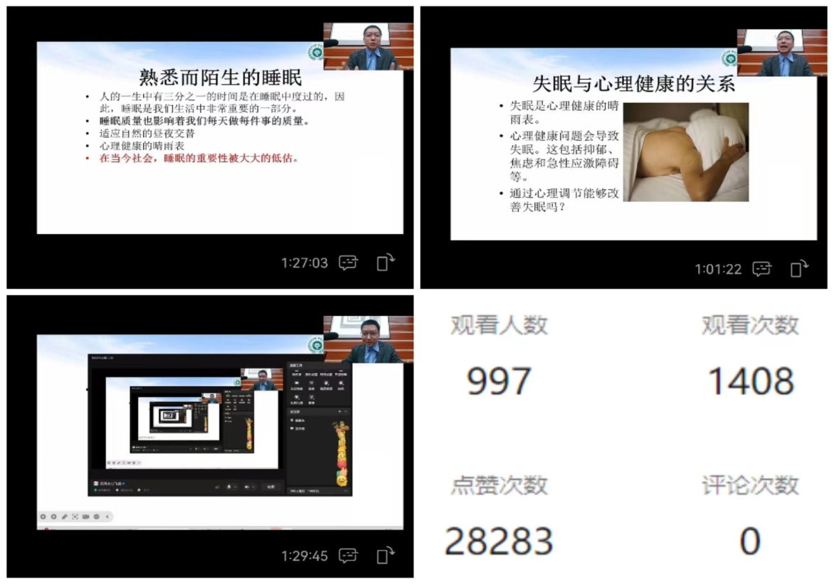 張主任指出:“隨著社會節(jié)奏的加快和來自于各方面壓力的增加,失眠障礙的患者也逐漸增多,必須要重視良好的睡眠習(xí)慣的培養(yǎng)、心理和環(huán)境的自我調(diào)試,從而改善睡眠質(zhì)量,達(dá)到理想的身體健康和心理健康水平”。現(xiàn)場參與師生200多人,在認(rèn)真聆聽后積極踴躍提問發(fā)言,一致認(rèn)為講授內(nèi)容易懂實(shí)用,線上參與人數(shù)近1000人,點(diǎn)贊量達(dá)到2.8萬多次。