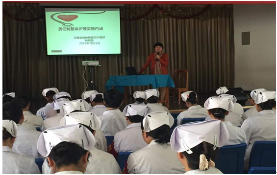 2015年6月21日15:00,云南省精神病醫(yī)院護(hù)理部組織進(jìn)行責(zé)任制整體護(hù)理實(shí)施內(nèi)涵的課程培訓(xùn),培訓(xùn)對象是護(hù)士長、責(zé)任護(hù)士、護(hù)理骨干,全院共102名科護(hù)理人員參加了此次培訓(xùn),占全院護(hù)理人員總數(shù)的42.5%,就責(zé)任制整體護(hù)理實(shí)施內(nèi)涵及工作要求進(jìn)行了培訓(xùn)。
