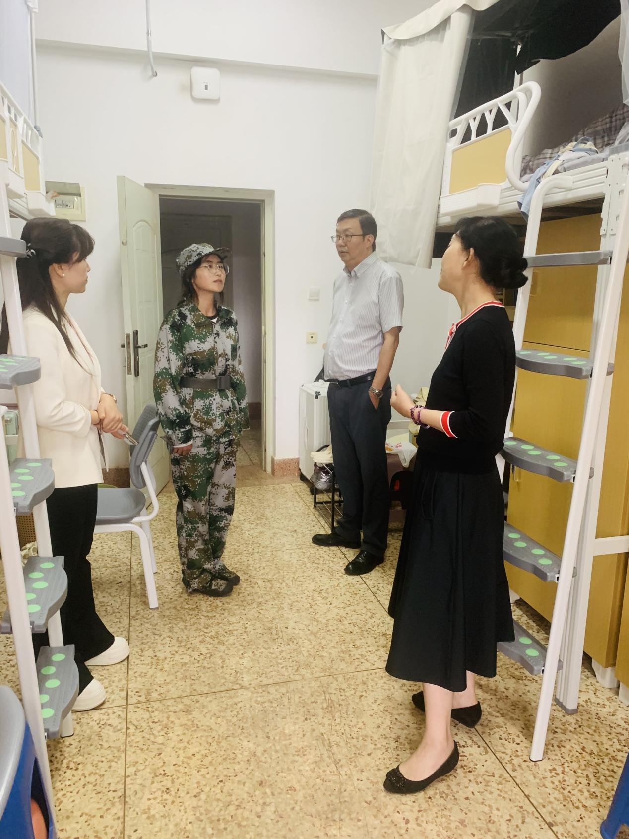 隨后,慰問組走進學生宿舍,關(guān)心同學們的居住環(huán)境與生活需求,傾聽軍訓體會與成長感悟。