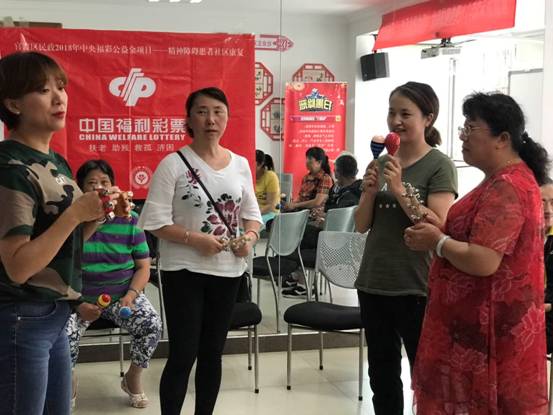 今天的活動(dòng)主題是“對(duì)立與融合”??祻?fù)治療師給大家發(fā)了例如沙錘、手鈴、手銅鑼等打擊樂(lè)器和單音樂(lè)器,引導(dǎo)患者及家屬表達(dá)情感,憤怒時(shí)敲響銅鑼,高興時(shí)搖沙錘,通過(guò)樂(lè)器來(lái)表達(dá)自己的情感或者情緒。之后18人分為兩組,分別由李老師和朱老師各帶一隊(duì),李老師帶領(lǐng)的隊(duì)伍為“對(duì)立面”朱老師帶領(lǐng)的隊(duì)伍為“融合面”,當(dāng)“對(duì)立面”響起聲音時(shí),“融合面”停止聲音,當(dāng)“融合面”響起聲音時(shí),“對(duì)立面”停止聲音,最好兩個(gè)面一起同時(shí)按節(jié)奏響起聲音,達(dá)到和諧。這樣的小游戲有利于幫著患者與家庭建立情緒的防御點(diǎn),正確處理不良情緒,避免用單一語(yǔ)言交流最后爭(zhēng)吵的情況。同時(shí)教會(huì)大家學(xué)習(xí)運(yùn)用樂(lè)器和其他方式來(lái)舒緩自己的不良情緒,記住使自己快樂(lè)的事情,不愉快時(shí)能夠?qū)W會(huì)轉(zhuǎn)移自己的注意力。