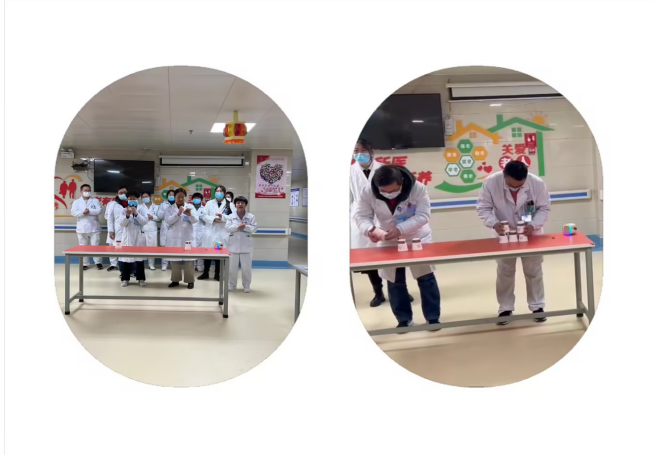 活動在工療護士謝蓉老師的籌備、科室工作人員的精心配合下,有序展開。伴隨著大家的熱烈掌聲,兩位小休養(yǎng)員感情飽滿的主持,節(jié)目以手指操大串聯(lián)開場,休養(yǎng)員李奶奶一曲動聽的歌曲帶動了大家的氣氛,李爺爺?shù)睦@口令讓大家喜笑顏開,其中一位休養(yǎng)員的弟弟給大家?guī)砹水?dāng)下最火“科目三”舞蹈表演,節(jié)目一個更勝一個精彩,大家表演完節(jié)目后,又做起了游戲,醫(yī)務(wù)人員共同參與其中,大家面對著面,心連著心,其樂融融,一片祥和。
