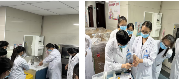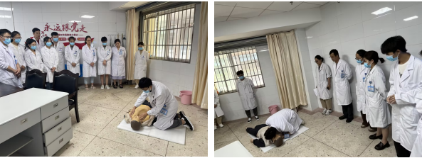 演練七:門診突發(fā)事件(隨機(jī)抽取人員):模擬患者在抽血過程中出現(xiàn)暈針暈血,首先停止抽血,然后判斷患者情況:如果患者意識清醒,攙扶好患者,可躺臥于候診椅上,保持頭低位,口服溫開水或糖水。若情況無好轉(zhuǎn),可撥打門診急救電話65618734;如果患者意識模糊,攙扶好患者,有條件下保持平臥,尋求其他醫(yī)護(hù)人員幫助,撥打門診急救電話65618734和上報醫(yī)務(wù)部(65625638)。若符合心肺復(fù)蘇搶救預(yù)案診斷要點(diǎn),進(jìn)行心肺復(fù)蘇。急救人員到達(dá)后,積極配合急救人員對危重患者進(jìn)行急救,搶救完畢,整理搶救現(xiàn)場。最后填寫《醫(yī)學(xué)檢驗(yàn)科突發(fā)事件記錄表》。