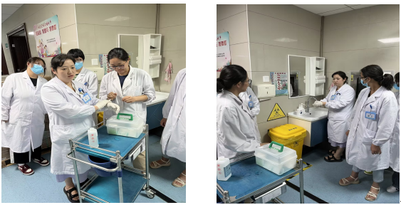演練四:職業(yè)暴露-銳器割傷(生化免疫組負(fù)責(zé)):模擬工作人員在抽血時發(fā)生手指穿刺傷,立即脫下手套,在流水下進(jìn)行沖洗,同時由遠(yuǎn)心端向傷口處進(jìn)行擠壓,至少1分鐘。然后用安爾碘消毒并進(jìn)行包扎,啟動“職業(yè)暴露預(yù)案”按照相關(guān)規(guī)定進(jìn)行上報、進(jìn)行本人及感染源相關(guān)檢查(HBVHCV、HIV、TP),上報院感辦公室進(jìn)行評估,視不同的感染源采取相應(yīng)的應(yīng)急措施。填寫《醫(yī)學(xué)檢驗(yàn)科突發(fā)事件記錄表》、《醫(yī)學(xué)檢驗(yàn)科職業(yè)暴露登記表》。