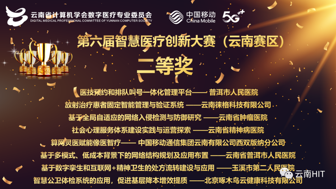 2023年7月1日,由云南省計(jì)算機(jī)學(xué)會(huì)數(shù)字醫(yī)療專業(yè)委員會(huì)主辦的第六屆智慧醫(yī)療創(chuàng)新大賽云南賽區(qū)決賽在云南普洱成功舉辦。我院喜獲第六屆智慧醫(yī)療創(chuàng)新大賽云南賽區(qū)二等獎(jiǎng)。第六屆智慧醫(yī)療創(chuàng)新大賽”是由中國科協(xié)新技術(shù)開發(fā)中心指導(dǎo),移動(dòng)醫(yī)療教育部-中國移動(dòng)聯(lián)合實(shí)驗(yàn)室發(fā)起,與全國各地相關(guān)協(xié)會(huì)學(xué)會(huì)聯(lián)合主辦的全國性創(chuàng)新賽事。