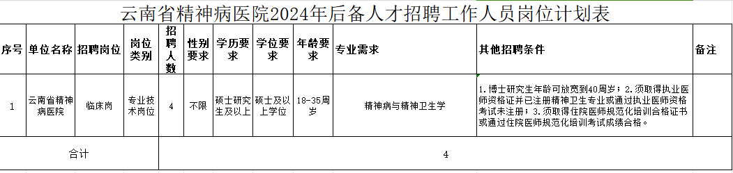 本次共招聘4人。具體招聘崗位及招聘條件詳見《云南省精神病醫(yī)院后備人才招聘崗位計劃表》(以下簡稱《崗位計劃表》)(附件1),可通過昆明市衛(wèi)生健康委員會官網(wǎng)(wsjkw.km.gov.cn)、昆明衛(wèi)生人才網(wǎng)(www.kmwsrc.com.cn)查詢詳細信息。
