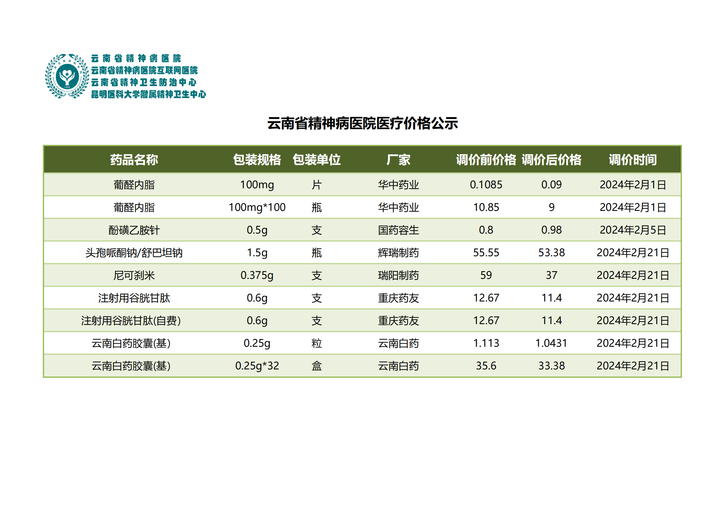 云南省精神病醫(yī)院醫(yī)療價格公示