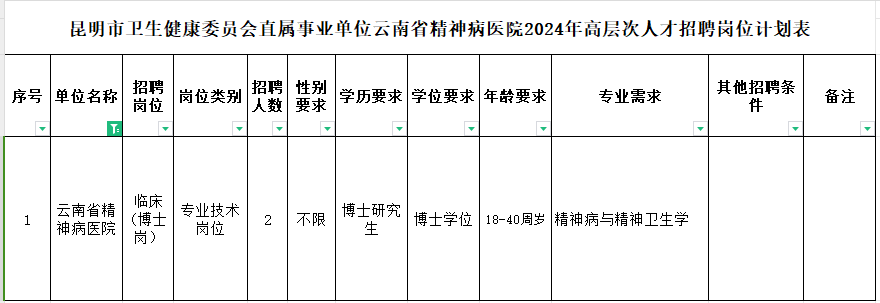 附件:昆明市衛(wèi)生健康委員會(huì)直屬事業(yè)單位云南省精神病醫(yī)院2024年高層次人才招聘崗位計(jì)劃表