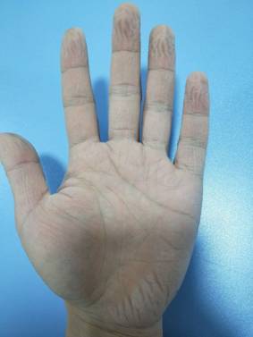 脫防護服出來后的手。因為提前2個小時就開始禁飲,加之穿防護服比較悶熱大量出汗,到23:40出來后大家都沒有上廁所,也許是穿紙尿褲不適應(yīng),兩邊髂前上棘有點發(fā)紅。