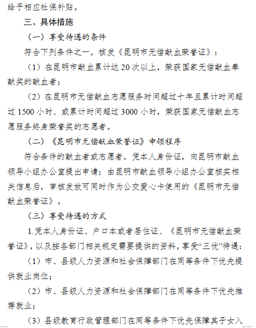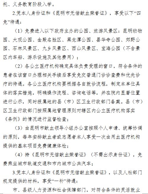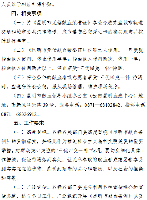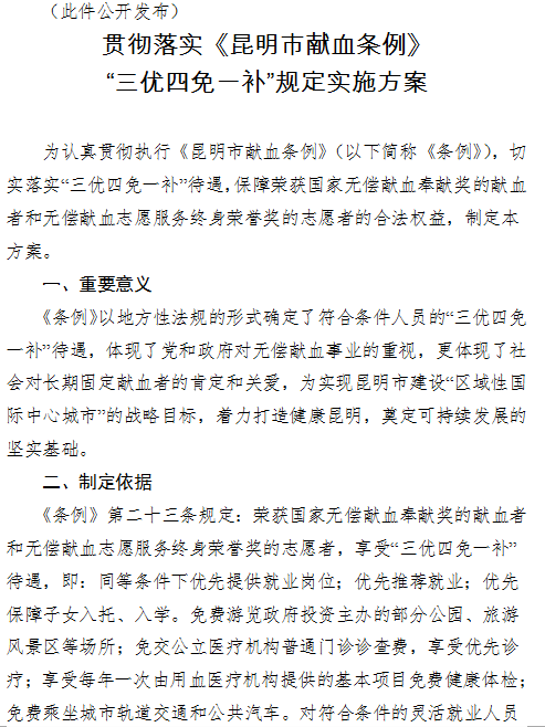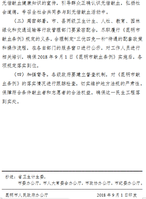 昆明市人民政府辦公廳關(guān)于印發(fā)貫徹落實(shí)《昆明市獻(xiàn)血條例》“三優(yōu)四免一補(bǔ)”規(guī)定實(shí)施方案的通知