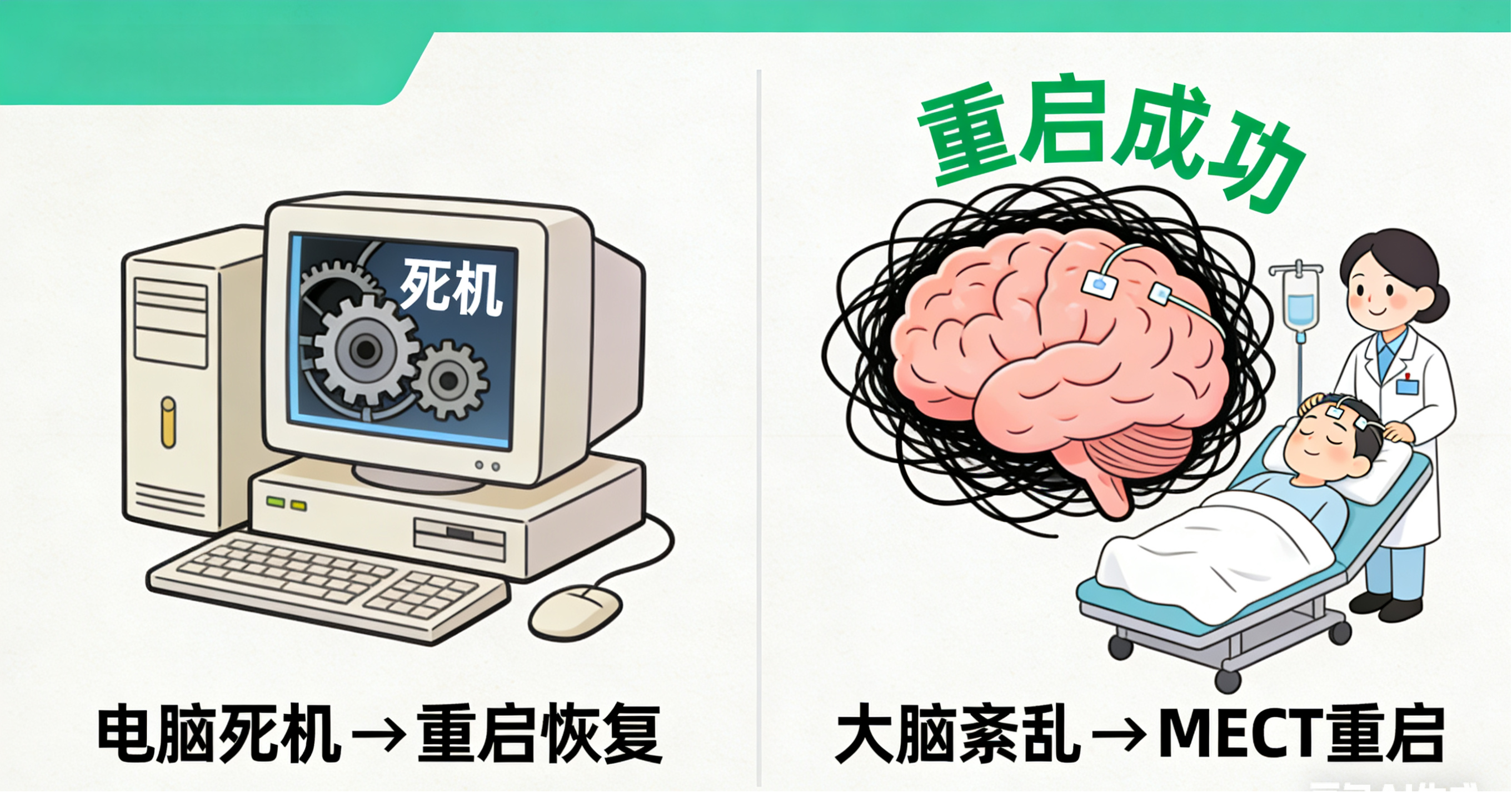 簡(jiǎn)單來說:MECT不是讓人“變傻”,而是幫大腦從“死機(jī)”狀態(tài)中“重啟”,讓真正的你重新回來。