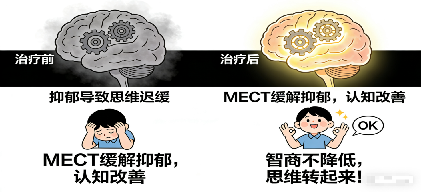 不會(huì)。 大量長(zhǎng)期隨訪研究證實(shí),MECT不會(huì)降低智商,也不會(huì)損害長(zhǎng)期的認(rèn)知功能(如邏輯思維、判斷力、學(xué)習(xí)能力)。相反,當(dāng)嚴(yán)重的抑郁癥狀(如思維遲緩、無法思考、注意力渙散)得到緩解后,患者的認(rèn)知功能往往會(huì)顯著改善,感覺“腦子重新轉(zhuǎn)起來了”。