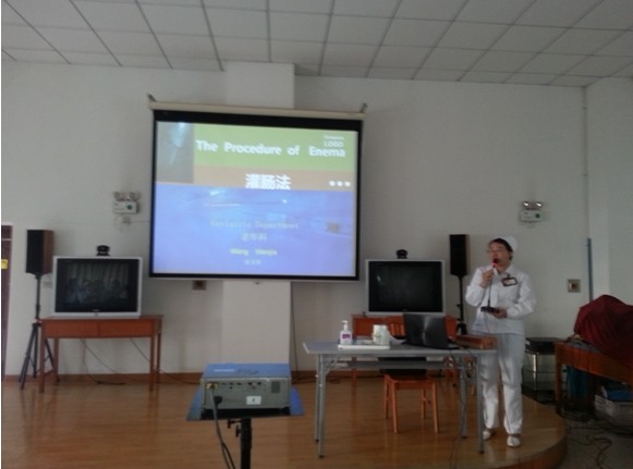 2014年3月18日下午16:00,云南省精神病醫(yī)院護理部組織開展我院第一期護理“雙語教學查房”。此次護理“雙語查房”由老年科護士汪文佳主講,以灌腸法為例,從灌腸法的定義(definition)、目的(purpose)、操作流程(procedure)、禁忌癥(attention)等方面用中英文對照的形式進行了講解。