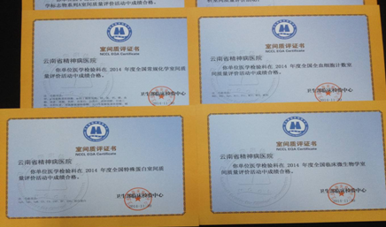 我科的質量方針為:公正、科學、準確、高效;在日常檢驗工作必須做到:行為公正、方法科學、數據準確、辦事高效;科室多年來一直按照ISO 15189:2003(2012)版《醫(yī)學實驗室-質量和能力專用要求》標準來制定科室質量手冊及工作程序文件,全體工作人員在實際工作中依據本質量手冊為準則開展各項工作,并不斷使其完善,通過嚴格執(zhí)行規(guī)章制度和培訓不斷強化科室人員的質量控制意識,推進全程質量管理和規(guī)范化操作,重點監(jiān)測分析前、分析中、分析后三大環(huán)節(jié),實行全程質控,確保檢驗質量。每日必做室內質控,每年必參加衛(wèi)計委臨床檢驗中心和云南省臨床檢驗中心的室間質量評價活動,均取得優(yōu)秀成績。