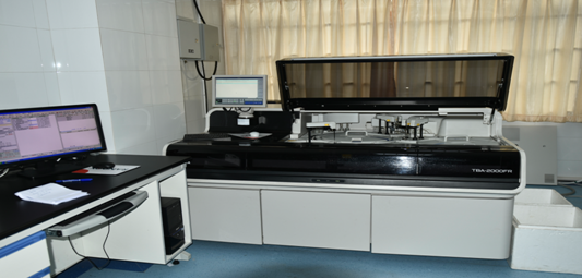 主要儀器設備有東芝TBA2000FR全自動生化分析儀 、日立7060C全自動生化分析儀、羅氏Cobas e601全自動電化學發(fā)光分析儀 、sysmex UF-500i/AX-4030全自動尿液分析系統(tǒng)、艾德康ADC ELISA Ⅲ全自動免疫分析儀、庫爾特ACT.5Diff AL全自動血細胞分析儀、Sysmex XE2100全自動血細胞分析儀、眾馳ZL-9100p全自動血液流變學分析、Waters e2695/2489/2465高效液相色譜分析系統(tǒng)等一批自動化的檢驗設備。